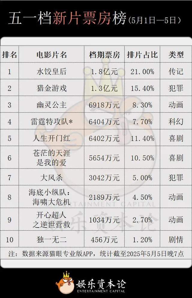 档期冠军《水饺皇后》,刘伟强执导,马丽主演的传记片。马丽此次不演喜剧,影片类型又偏冷门。不过,影片凭借马丽真挚的表演,导演对叙事节奏的精准把控,最终在艰难的市场环境中突出重围。影片五一档票房1.8亿元,第三方平台预测总票房会达到4亿元。